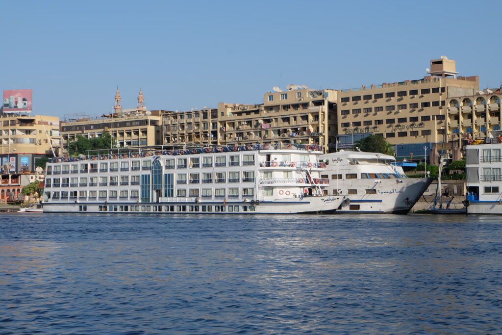 หลังจากเช็กอินเข้าที่พักไม่นาน เราก็ออกมาล่องเรือรับลมเย็นๆ ชมบรรยากาศริมสองฝั่งแม่น้ำไนล์ ซึ่งก็มีทั้งโรงแรม ร้านอาหาร และเรือขนาดใหญ่สำหรับทริปท่องเที่ยวแม่น้ำไนล์